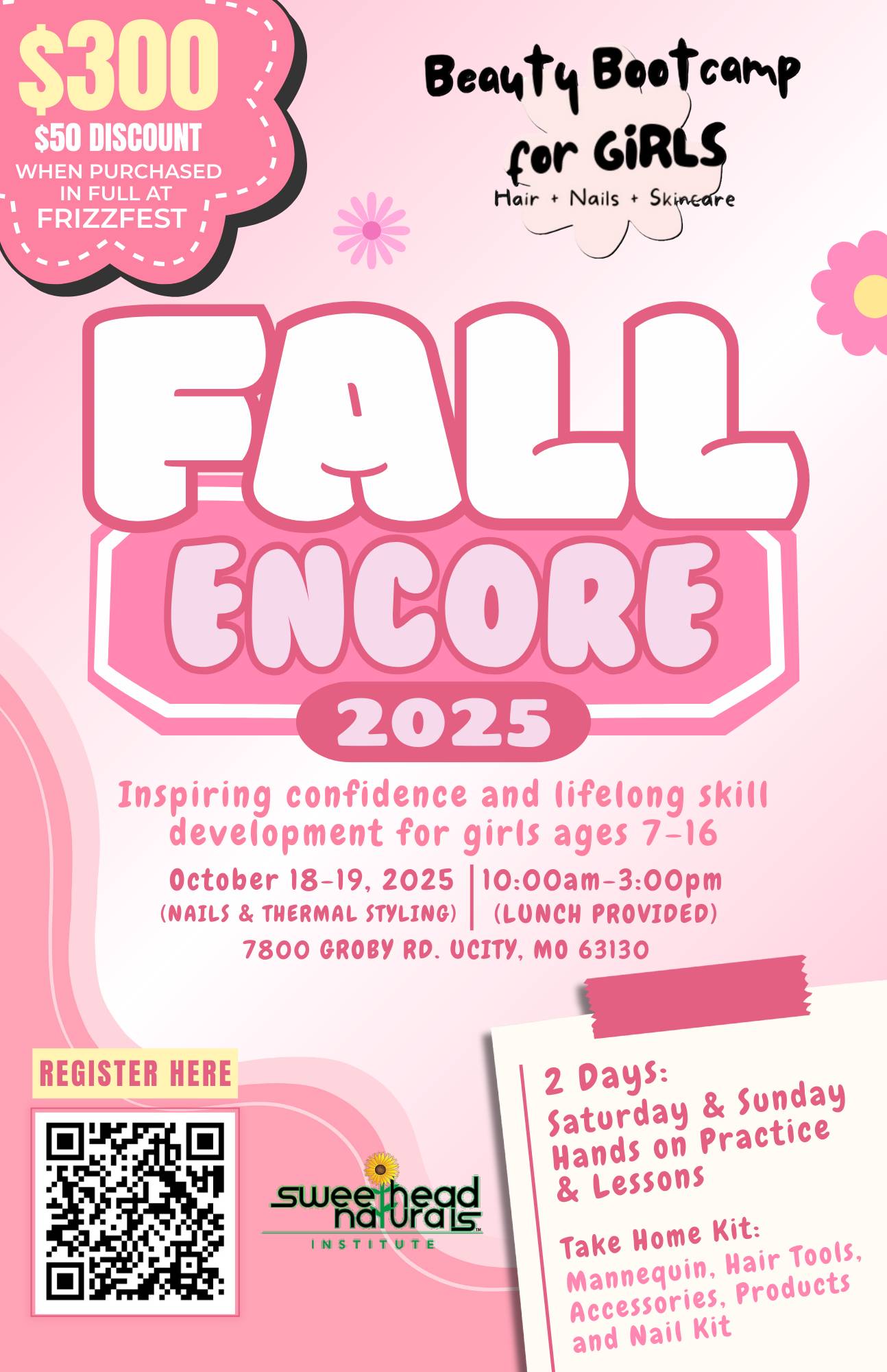 Students will receive expert-led lessons in nails and thermal styling, enjoy lunch provided daily, and leave with a take-home kit that includes a mannequin, hair tools, accessories, products, and a nail kit. It's more than beauty—it’s about sisterhood, self-expression, and starting the journey early. And don’t forget—save $50 when you register in full at FrizzFest! 💅🏽✨