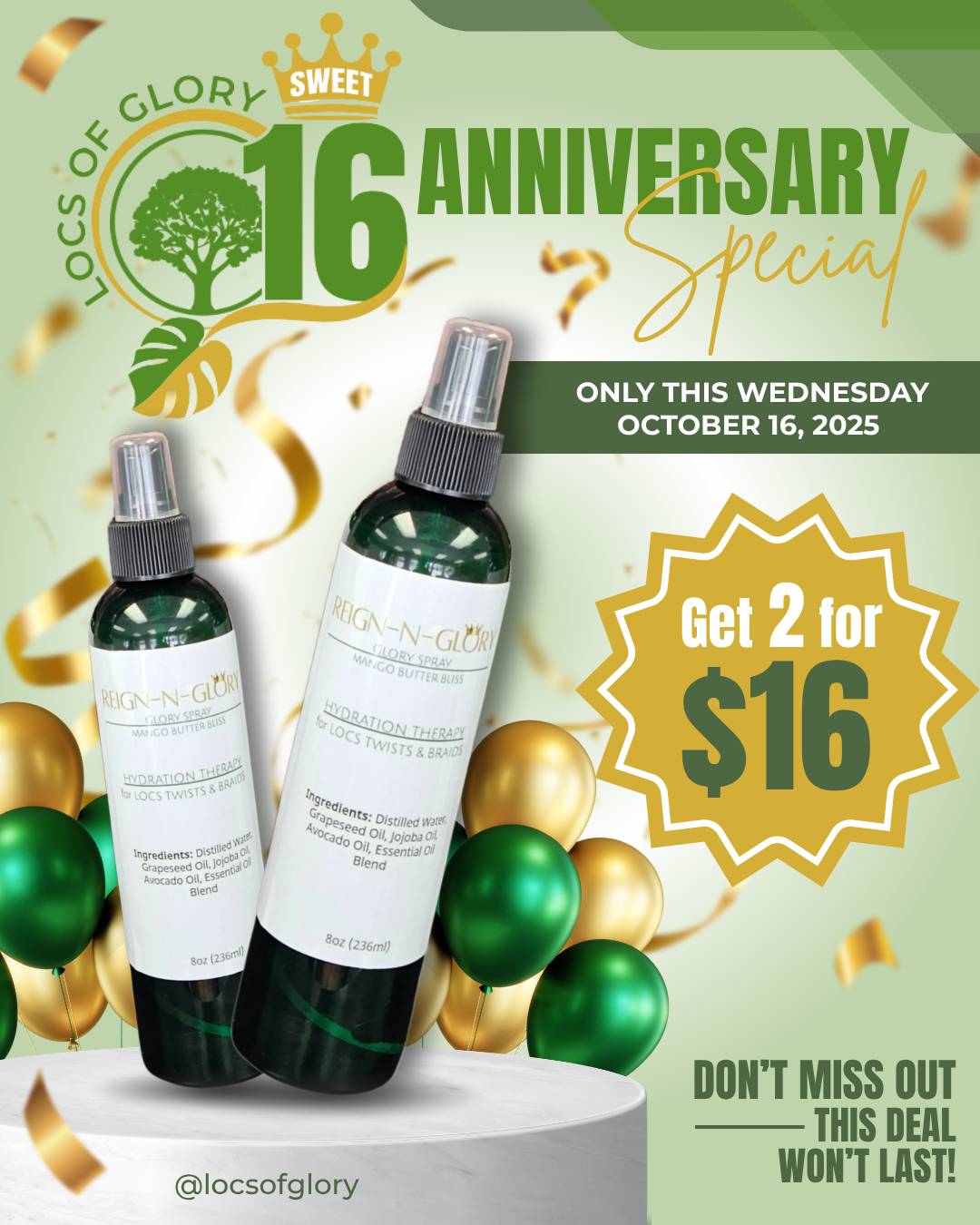 We’re turning SWEET 16—and you’re invited to celebrate with a deal too good to miss! In honor of our anniversary, Locs of Glory is offering a one-day-only special on our beloved Reign-N-Glory Glory Spray.