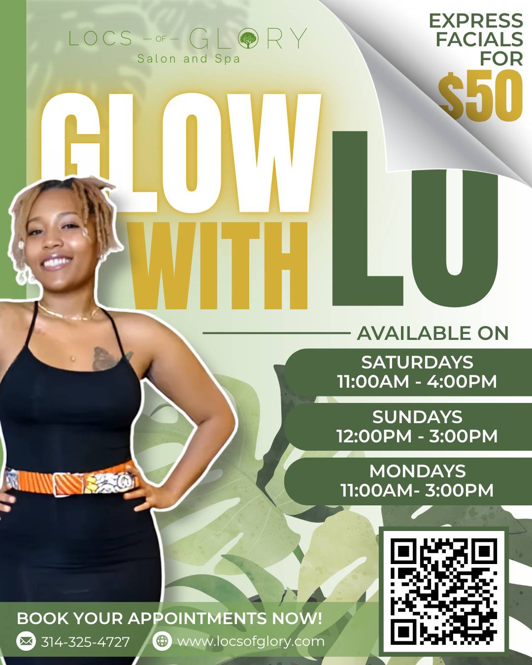 Fall is the perfect time to refresh your skin and unwind—and Lo is here to help you do just that. As one of our spa specialists at Locs of Glory, Lo brings expert hands and a calming presence to every session. Her Express Facial is available for just $50, making it the perfect seasonal treat to restore hydration, brighten your complexion, and give your skin the care it craves after summer.