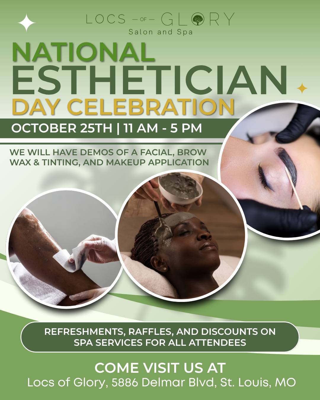 Join Locs of Glory on October 25th from 11 AM to 5 PM as we celebrate the talented hands and healing hearts behind your glow—our amazing estheticians! This special event is all about showcasing the beauty and science of skincare, with live demos of facials, brow waxing & tinting, and makeup application you won’t want to miss.