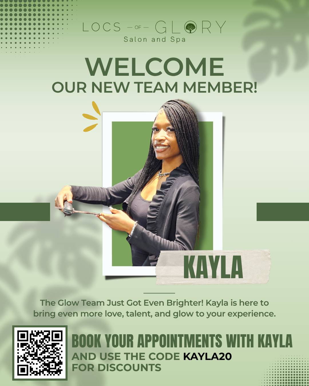 We’re thrilled to introduce Kayla, the newest member of the Locs of Glory team! With her passion for beauty and commitment to excellence, Kayla is here to bring even more love, talent, and radiance to your self-care experience. Whether you’re coming in for a fresh style, relaxing service, or just some “you” time, you’re in expert hands.
