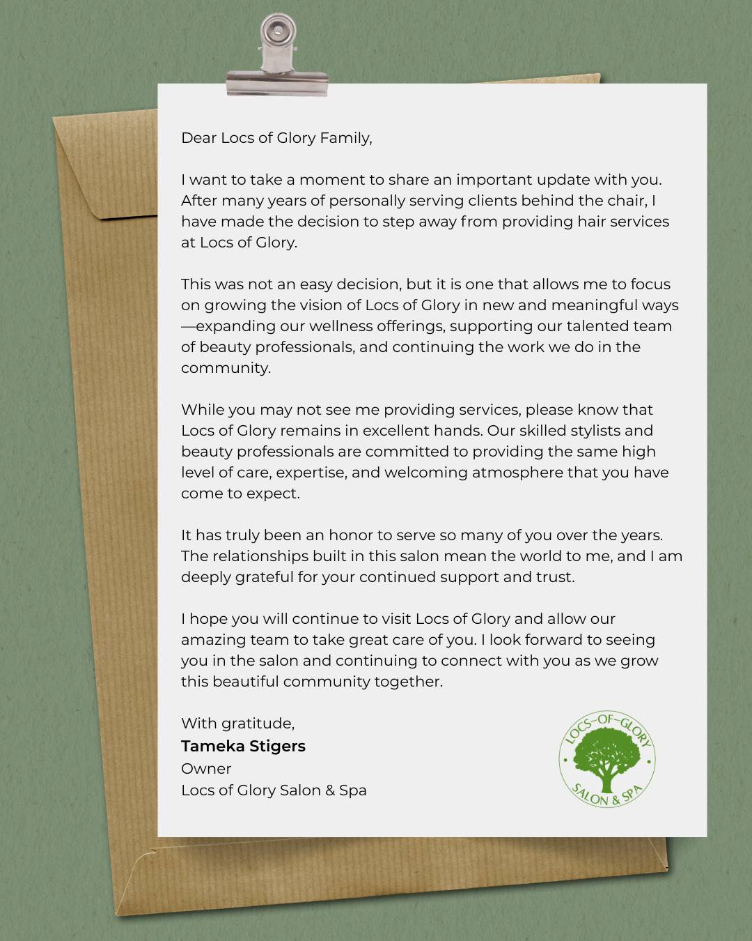 In this heartfelt message, Tameka Stigers shares an important update about her role at Locs of Glory. After many years serving clients behind the chair, she is stepping into a new chapter focused on growing the salon’s vision, supporting the talented team, and continuing to build a strong community space for beauty, wellness, and connection.