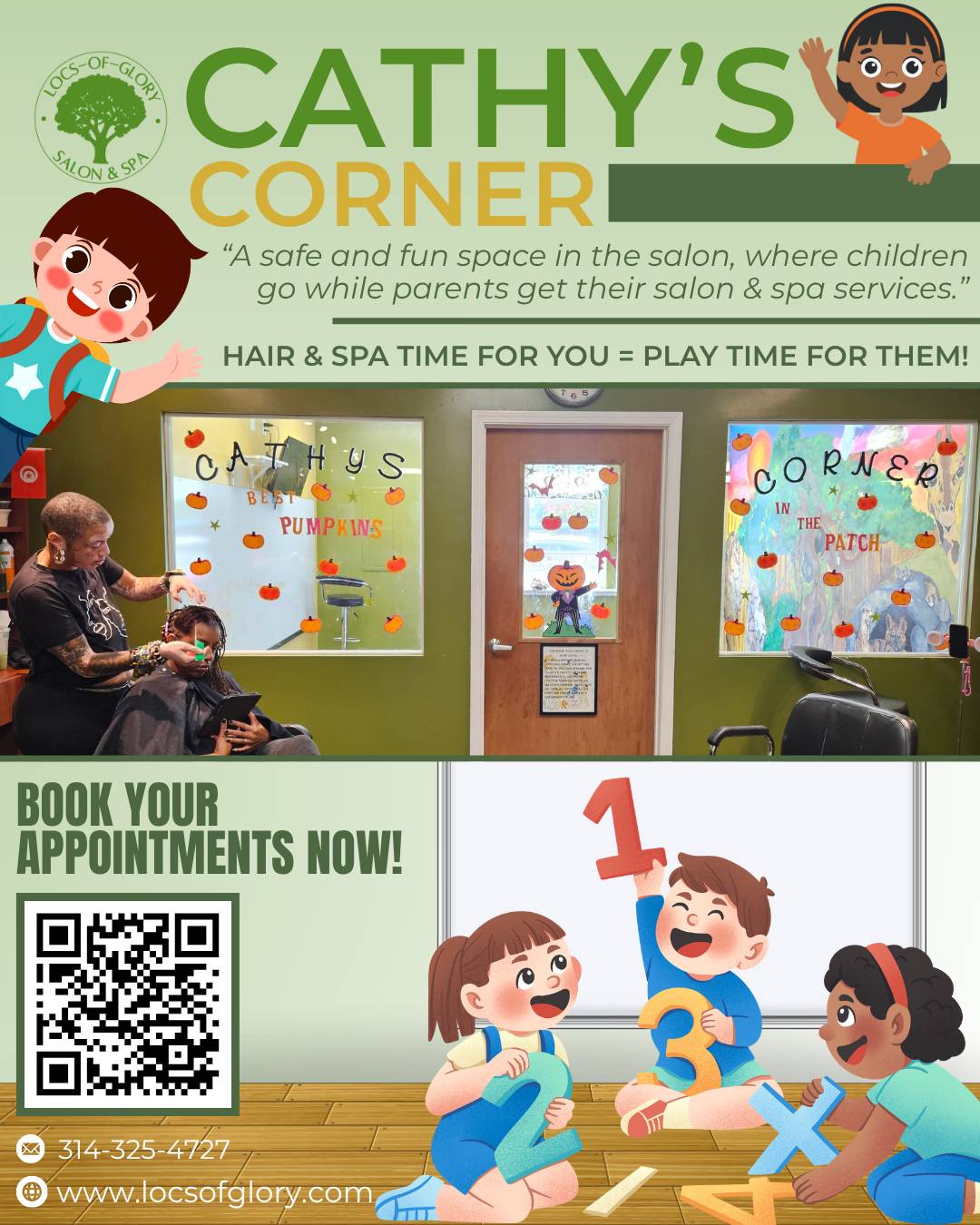 Cathy’s Corner is a safe, cozy, kid-friendly area inside the salon where children can relax, read, or play while you enjoy your service stress-free.