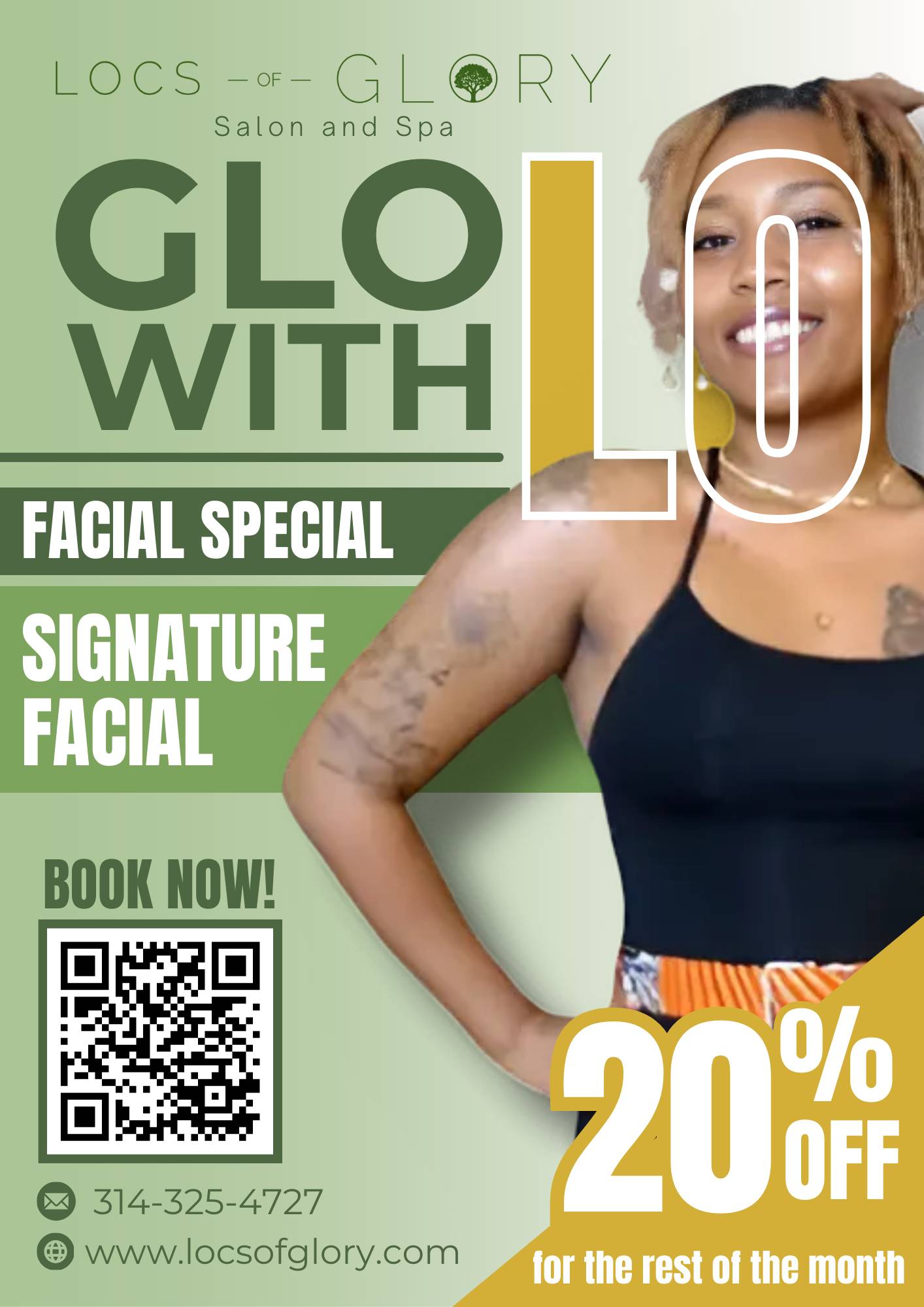 This month, step into your glow with Lo, one of our skilled spa specialists at Locs of Glory! She’s offering her signature touch with a 20% OFF Signature Facial—a service designed to help you relax, refresh, and reveal your radiant skin just in time for the season change.
