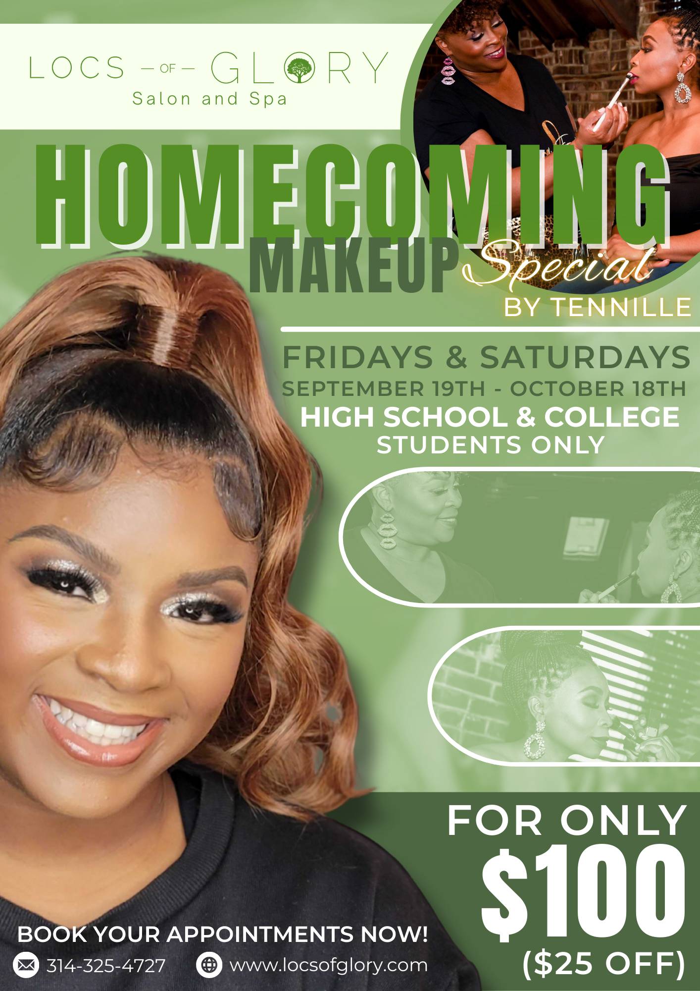 It’s Homecoming season—and we're here to make sure you shine. From September 19th to October 18th, Locs of Glory is offering professional makeup services for only $100 (that’s $25 OFF) exclusively for high school and college students.