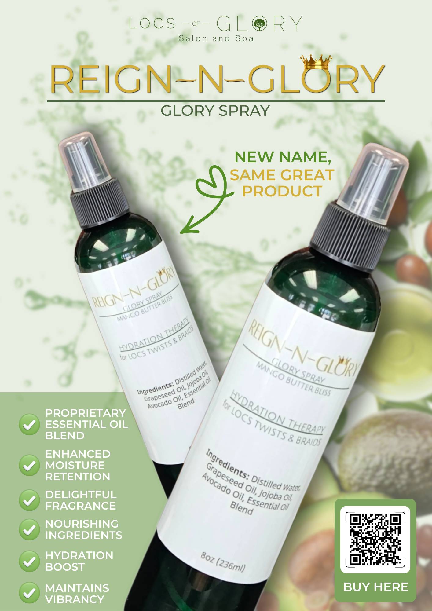 Introducing Reign-N-Glory—our rebranded product line with the same beloved formula and signature scent you've trusted for your protective styles. Whether you’ve used it for locs, braids, or natural care, rest assured: nothing has changed but the name. The hydration, scalp refreshment, and lightweight shine are exactly what your crown deserves.